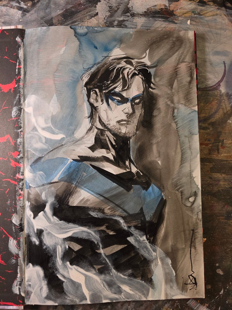 an original illustration of Nightwing created inside the Batman Legacy Cowl hardcover hardcover by DC Comics series artist Dustin Nguyen.